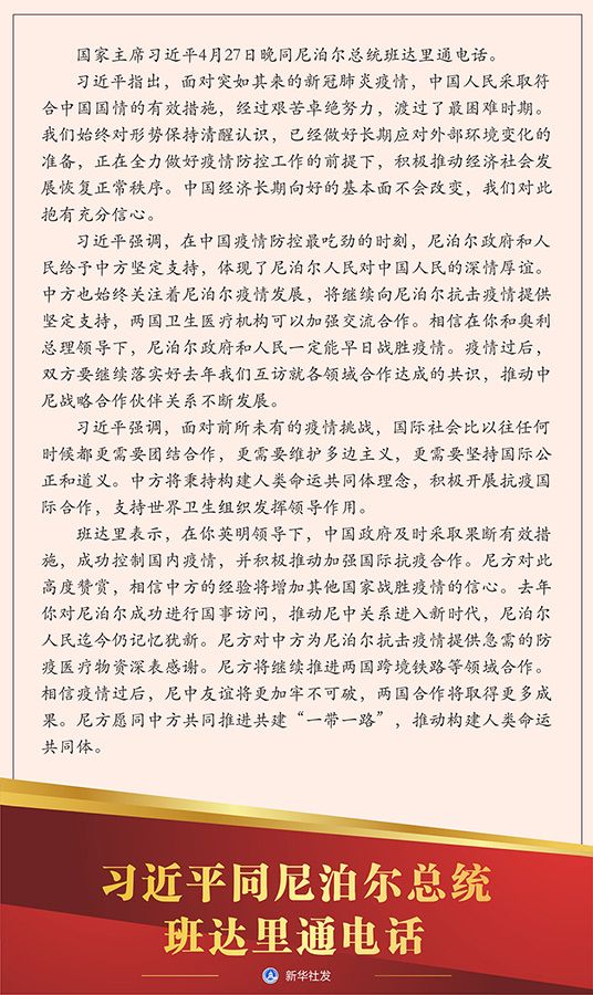 习近平强调,在中国疫情防控最吃劲的时刻,尼泊尔政府和人民给予中方坚定支持,体现了尼泊尔人民对中国人民的深情厚谊