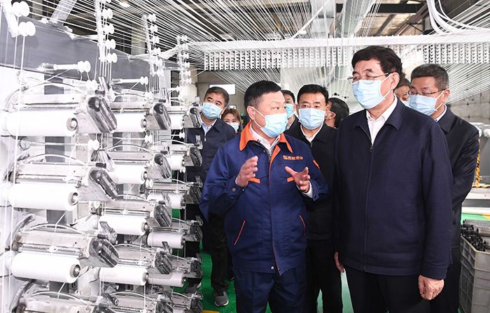 4月14日,巴音朝鲁在吉林博晟塑业有限公司调研疫情防控、复产达效情况巴音朝鲁高度重视脱贫攻坚和备春耕生产
