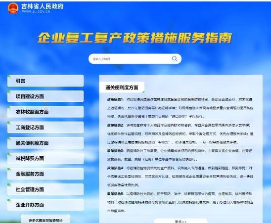 为了让企业家、创业者可以精准查找、直接咨询企业复工复产后比较关心的若干政策措施落实,日前,吉林省政府网站按照省委、省政府部署,将吉林省积极稳妥推进复工复产相关政策、具体措施设置专题集中公布,上新重磅专题《企业复工复产政策措施服务指南》(http