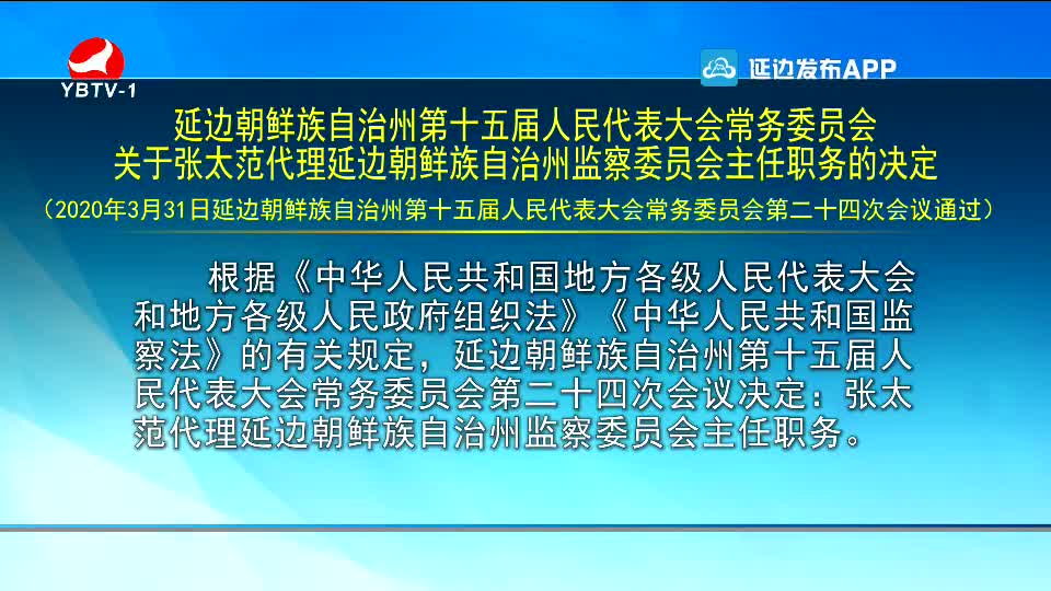 延边朝鲜族自治州第十五届人民代表大会常务委员会关于张太范代理延边朝鲜族自治州监察委员会主任职务的决定