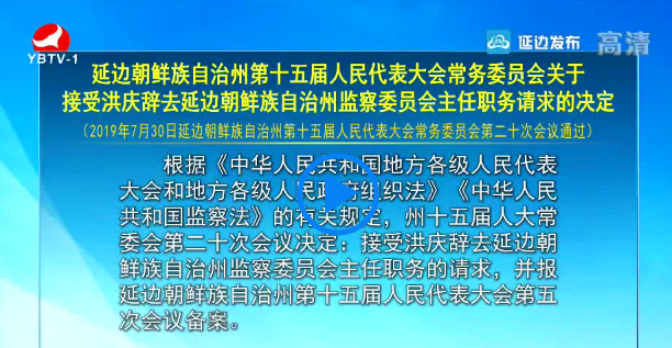 延边朝鲜族自治州第十五届人民代表大会常务委员会关于接受洪庆辞去延边朝鲜族自治州监察委员会主任职务请求的决定