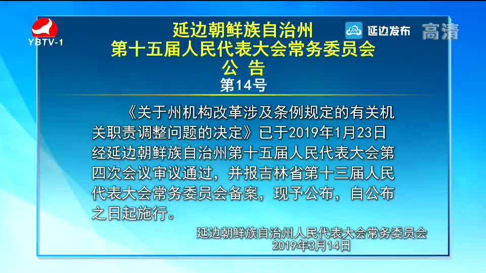 延边朝鲜族自治州 第十五届人民代表大会常务委员会 公告