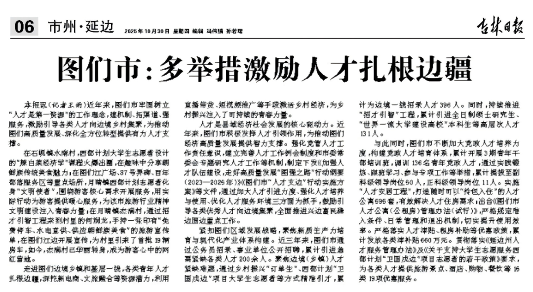 吉林日报 | 图们市:多举措激励人才扎根边疆