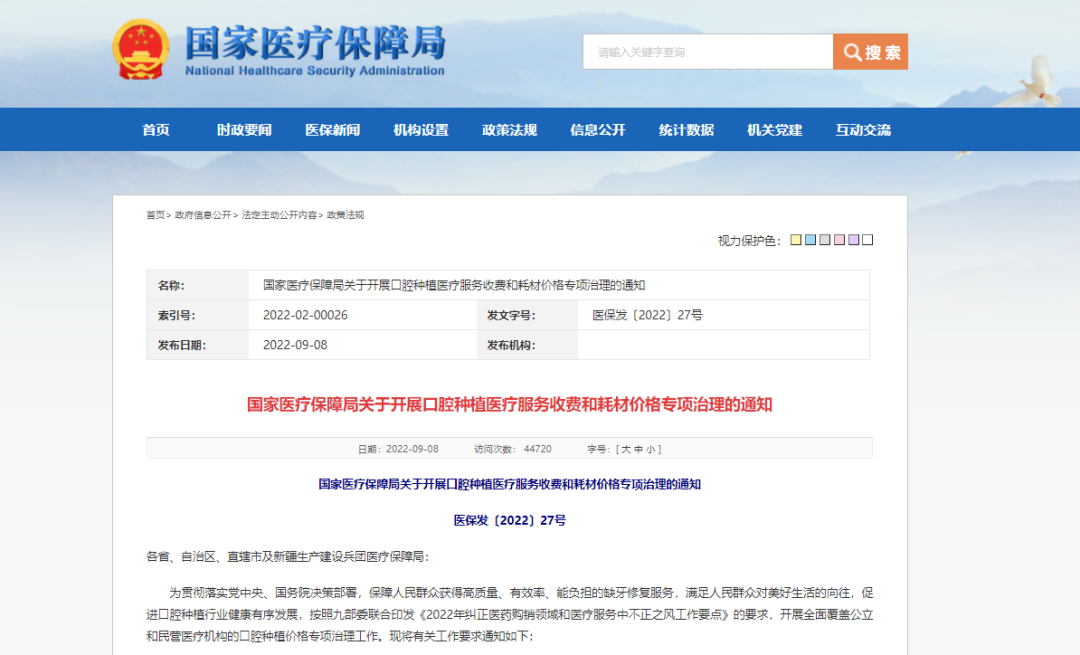 近日,针对口腔种植领域收费不规范、费用负担重等问题,国家医保局发布了《国家医疗保障局关于开展口腔种植医疗服务收费和耗材价格专项治理的通知》。