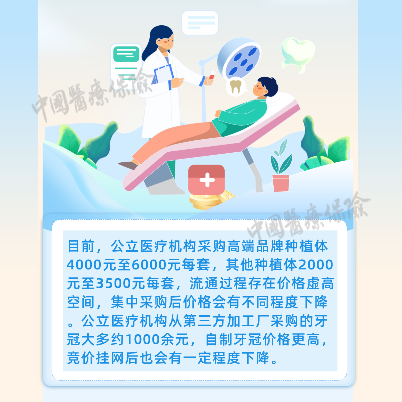 根据医保局发布的政策可知,各省级医疗保障部门在种植体集采、牙冠竞价的结果产生后,进一步合并制定并公开本地区种植牙全流程价格调控目标(含种植体、牙冠、医疗服务)。