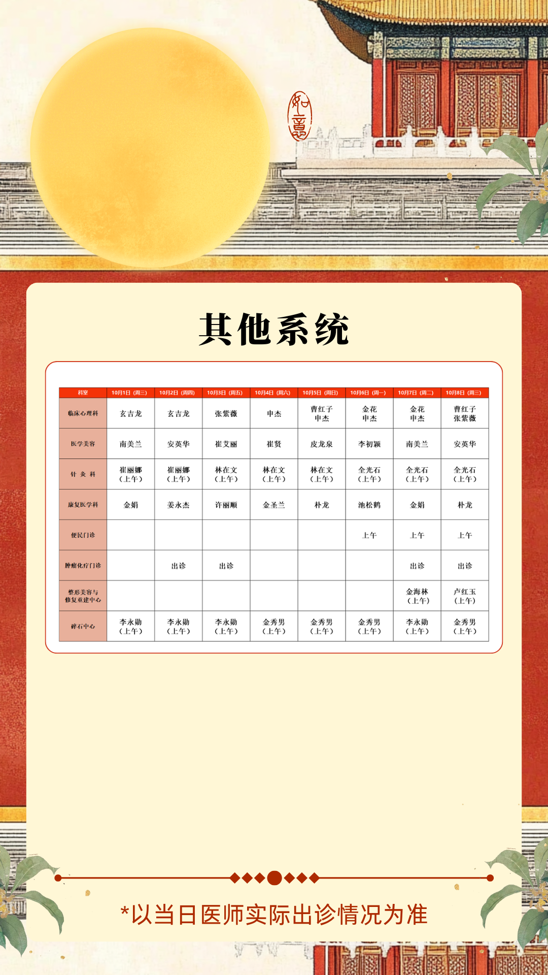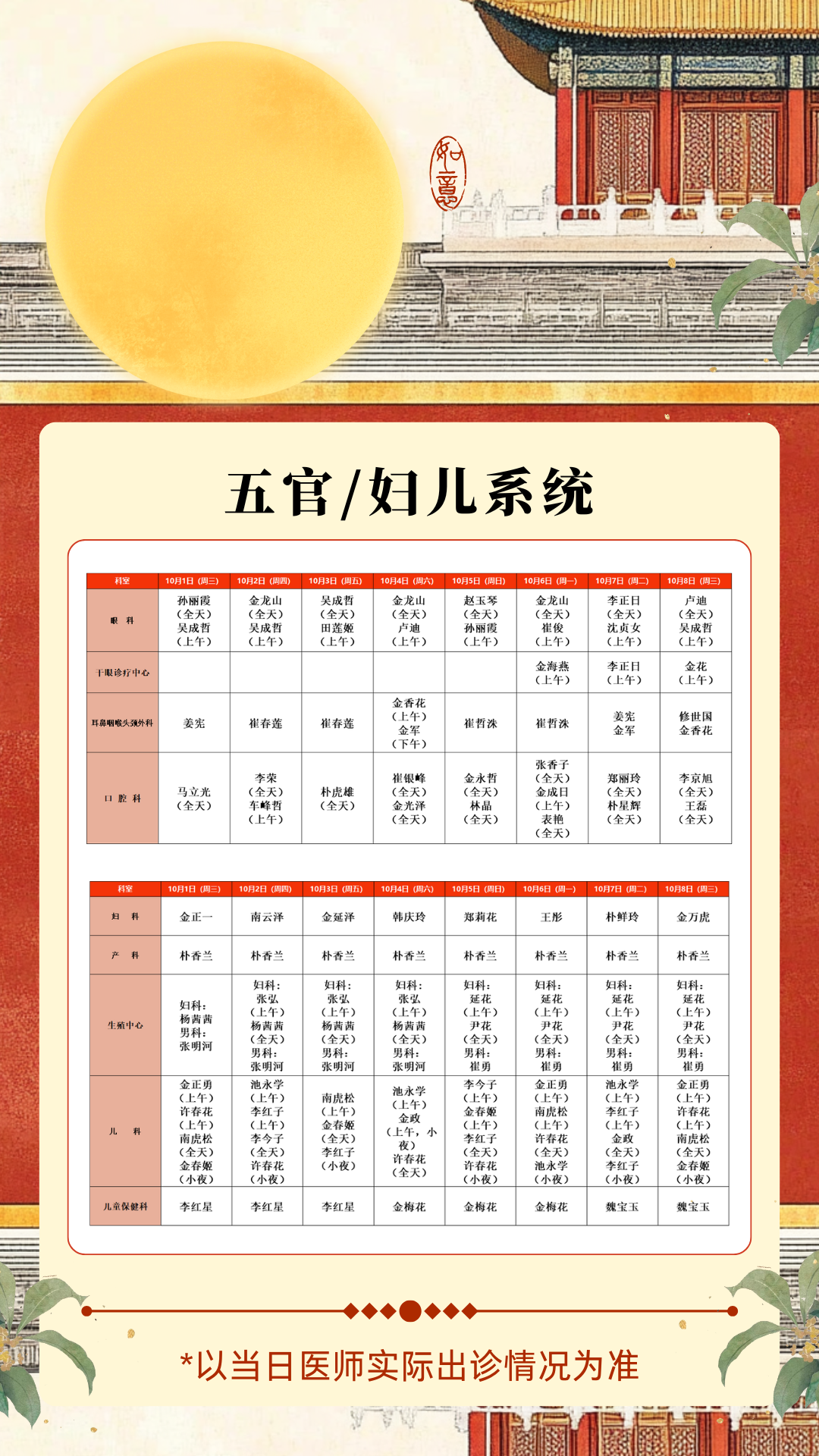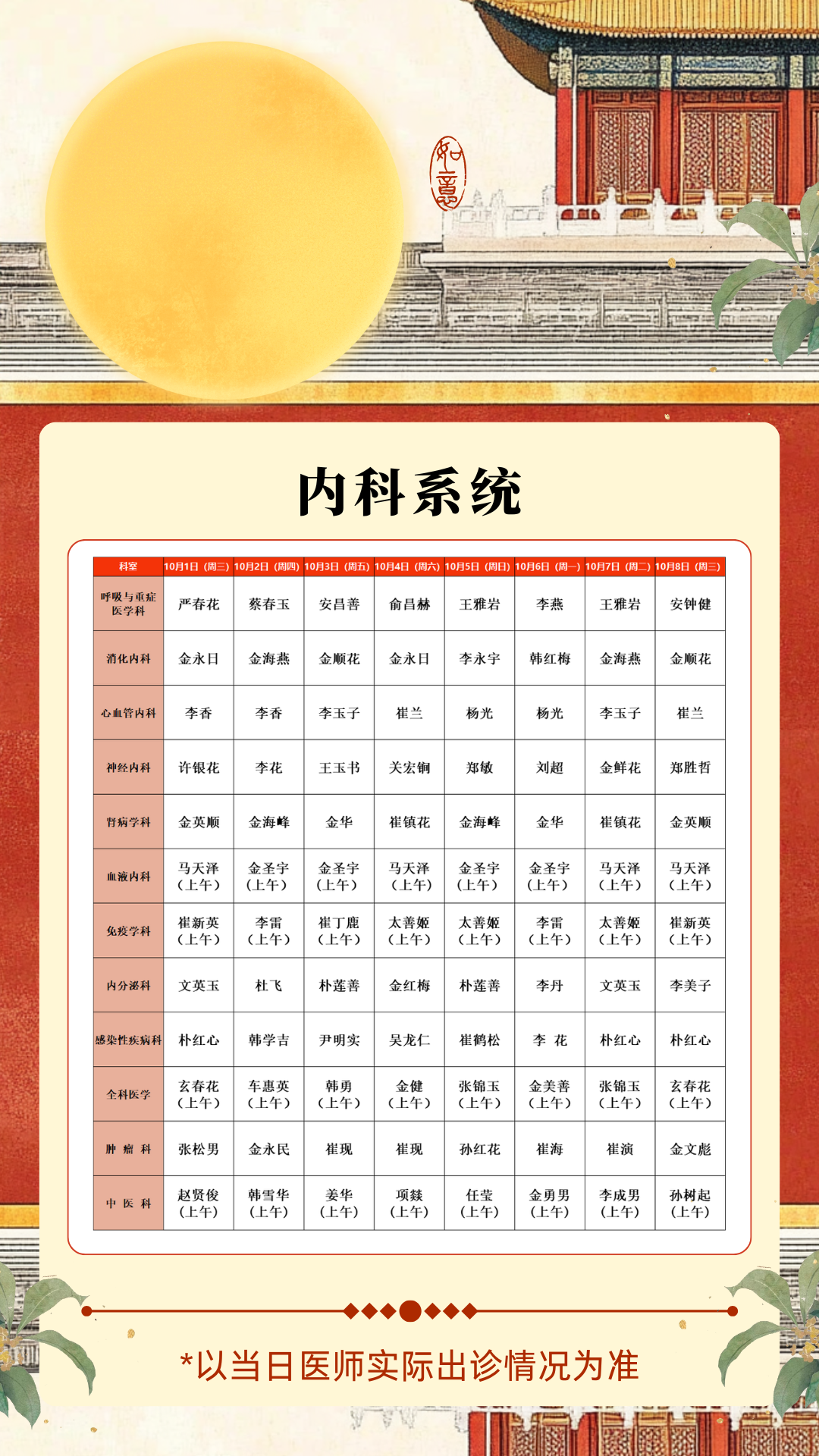 延边大学附属医院(延边医院)国庆、中秋双节期间门诊医生出诊表