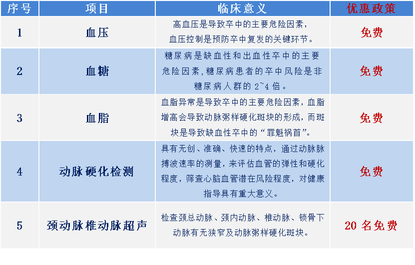 活动期间为脑卒中高危人群免费提供以下健康体检项目