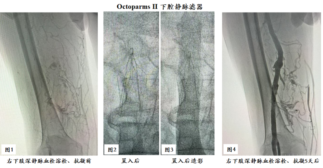 滤器置入后术溶栓抗凝治疗:经右侧足背静脉溶栓、抗凝5天,造影显示静脉血栓完全消失(图4)后出院。