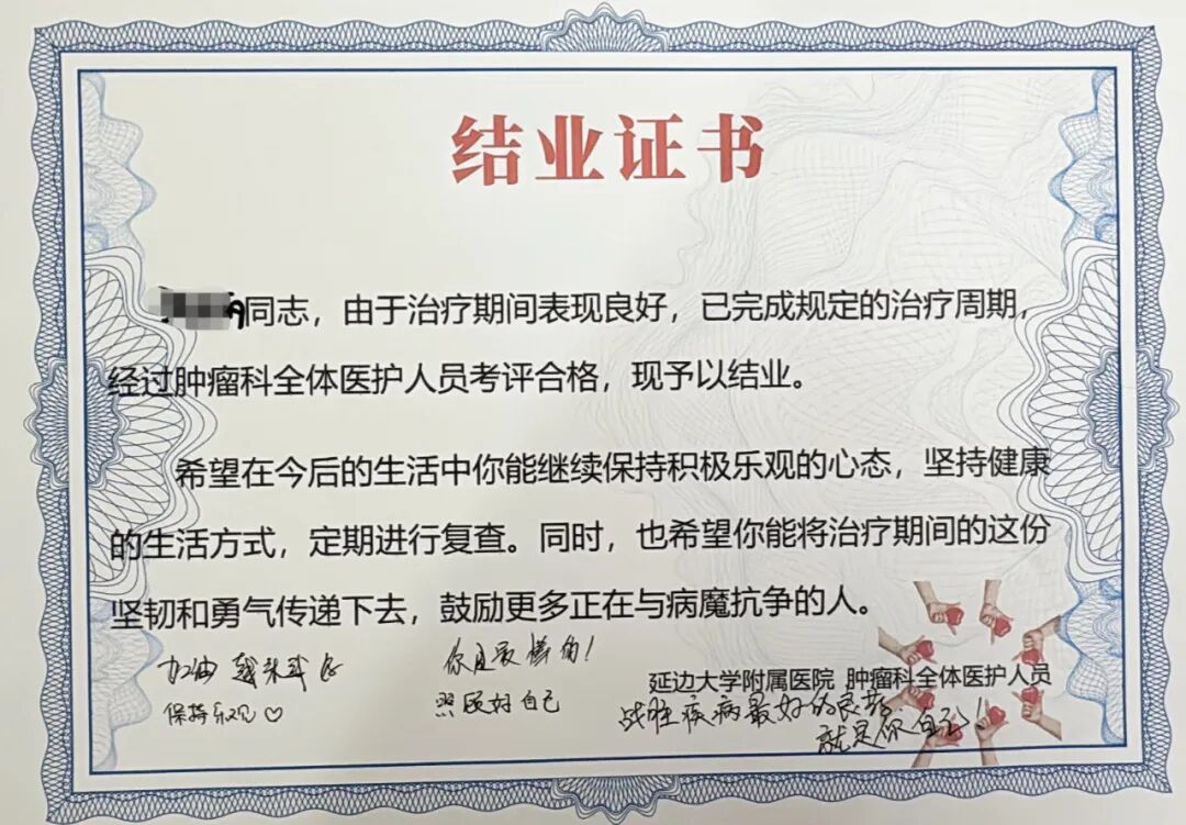 在延边大学附属医院(延边医院)内科十一(肿瘤科一)护理单元的病房里,两名女性病友看着个案管理师们双手递来的那张特别的“结业证书”,泪水瞬间盈满了眼眶。这张薄薄的纸,承载了她们过去几年里所有的艰辛、恐惧与希望。证书上清晰地记录着医生的亲笔祝福、个案管理师的关切话语,一种感动席卷而来。