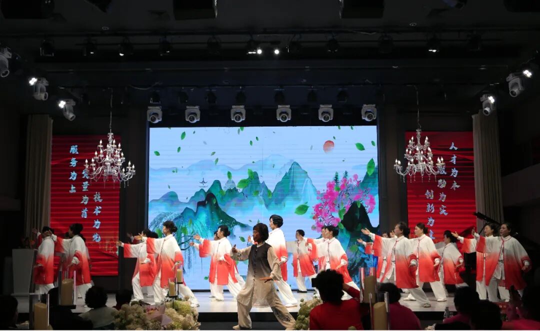 太极拳活动小组老师们着统一服装,迈着整齐的步伐,伴随着悠扬激昂的《我的祖国》入场表演十三式太极拳。