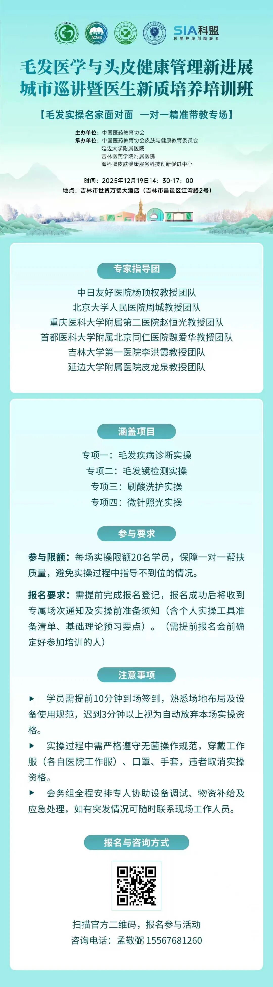 随着脱发防治与头皮养护技术的不断提高,正确、规范地运用新技术进行联合治疗成为毛发医学与头皮健康管理领域医护人员亟待提升的关键技能。由中国医药教育协会主办、延边大学附属医院(延边医院)、吉林医药学院附属医院承办的“毛发医学与头皮健康管理新进展城市巡讲暨医生新质培养培训班”,将于2025年12月19日至21日在吉林市举办,会议将邀请多位行业专家、学者进行授课和现场实操演示,旨在提高毛发医学与头皮健康管理医护人员对新技术新进展的应用能力。
