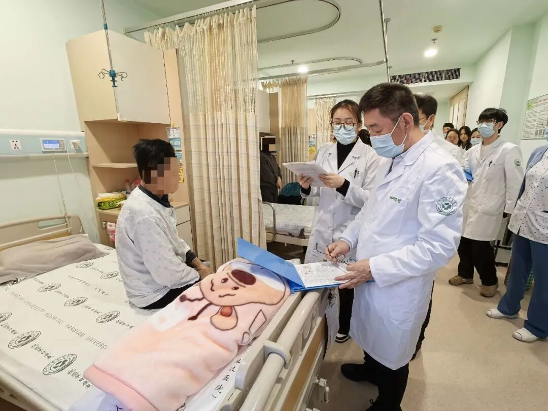 汇报结束后,韩明哲教授深入血液内科病房开展查房指导。在病床旁,他仔细查看患者病历,耐心询问患者病情及治疗情况,与科室医护人员围绕复杂病例的诊断思路、治疗方案进行深入探讨。他强调,临床诊疗需兼顾精准性与人文关怀,既要依托先进技术提升诊疗水平,也要关注患者的身心需求,真正践行“以患者为中心”的服务理念。