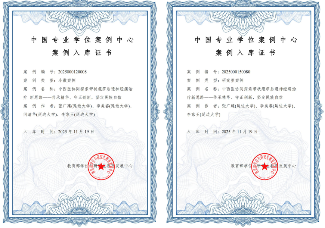近日,延边大学附属医院(延边医院)疼痛科主任张广建带领团队成员李美睿、闫清华、李京玉等人,领衔完成的主题案例《中西医协同探索带状疱疹后遗神经痛治疗新思路—传承精华,守正创新,坚定民族自信》,经过遴选与严格评审,成功入选中国专业学位案例中心国家主题案例库。该案例的入库,标志着我院在推动中西医结合治疗慢性疼痛的临床实践与医学教育创新方面,获得了国家级平台的权威认可,为医院学科建设与发展树立了新的标杆。
