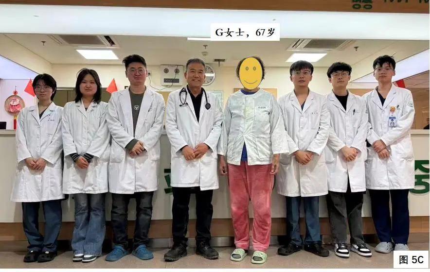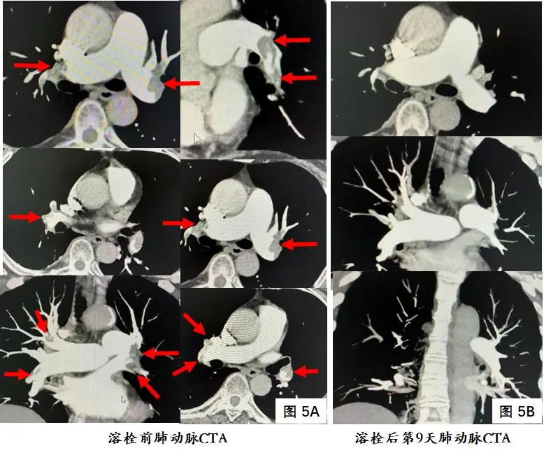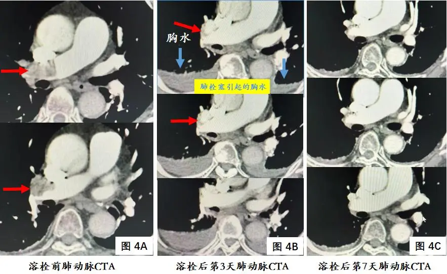 G女士,67岁。以“呼吸困难5天”在当地医院就诊,当地医院诊断为“肺栓塞”急转我院。该患者11年前接受乳腺Cancer手术治疗。术后迄今接受靶向药物治疗。3年前因“肺栓塞”行介入取栓治疗。安君团队即行肺动脉CTA以及下肢造影。结果显示左下肢深静脉血栓,肺动脉栓塞(图5A)。经过9天“延边方案”治疗(图5B),肺栓塞CTA下清零,出院(图5C)。后继续口服抗凝。