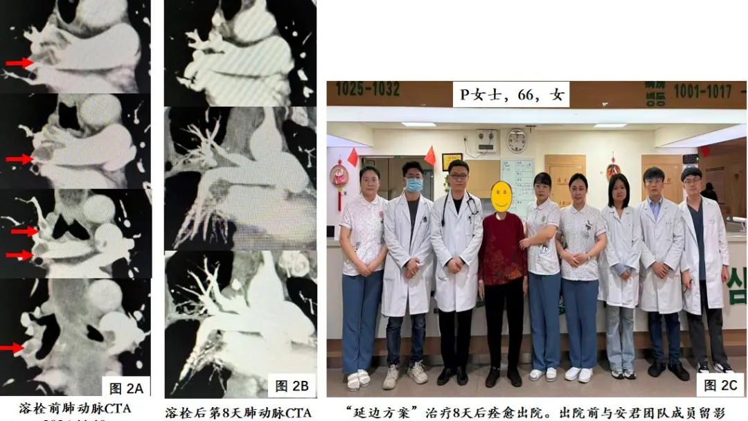 P女士,66岁。以“左下肢胀痛15天”为主诉急诊收入院。超声提示左下肢深静脉内广泛血栓。根据患者临床表现(胃癌切除以及系统化疗后)、超声结果、静脉造影结果以及严密的观察,高度怀疑合并肺栓塞,即行肺动脉CTA,确诊为肺栓塞(图2A)。经过8天“延边方案”治疗,肺栓塞CTPA下清零(图2B),出院(图2C)。出院后继续口服抗凝。