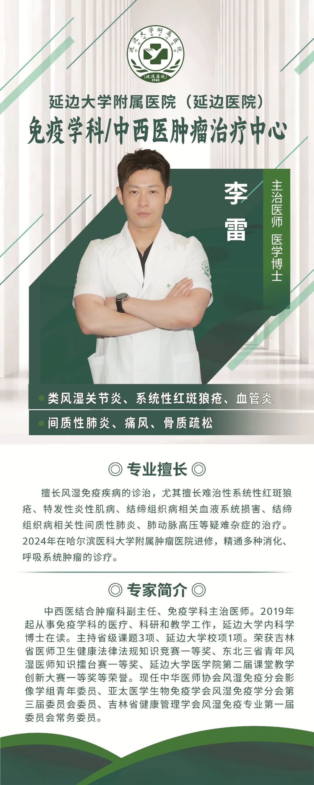 今年35岁的李雷已拥有8年免疫学科临床经验,擅长诊治痛风、高尿酸血症、雷诺综合征、类风湿性关节炎、系统性红斑狼疮、间质性肺炎等疾病。同事介绍:“他在痛风患者中口碑很好,治疗过的患者对他评价都很高。”因疗效显著,李雷接诊的患者已从延边州内扩展至全国各地。同事们笑称他为“延边痛风守护者”,虽然是句玩笑,但却是对他医德和医术的认可。