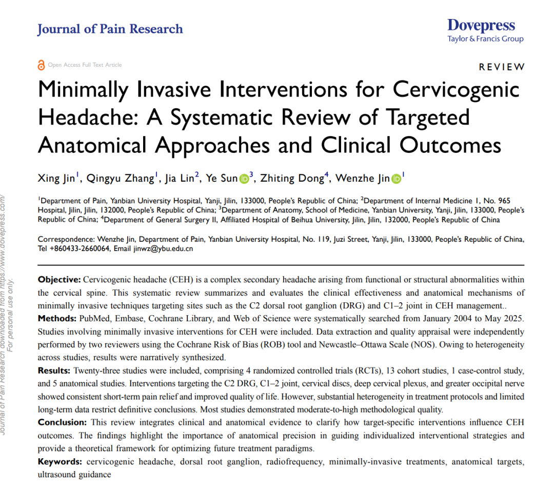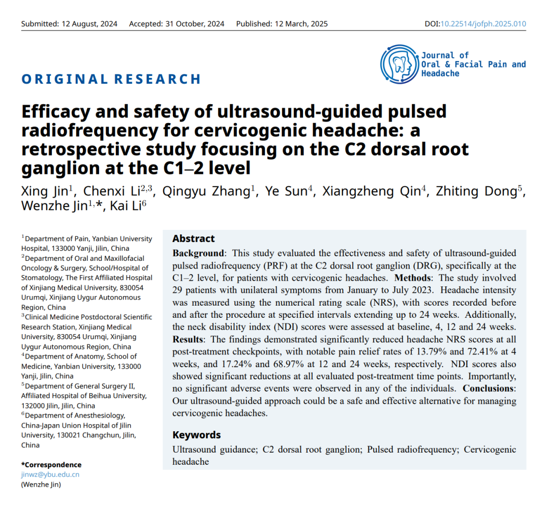 近日,延边大学附属医院(延边医院)疼痛科金文哲主任医师团队在颈源性头痛治疗领域取得重大科研成果。团队研发的超声引导脊柱斜位颈2背根神经节穿刺技术,经临床研究验证安全有效,相关成果已发表于《JournalofOral&FacialPainandHeadache》和《JournalofPainResearch》两本国际知名SCI期刊,为颈源性头痛的微创治疗提供了全新路径。