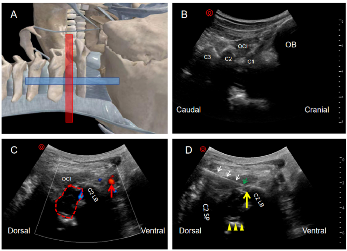 (A)超声探头摆放的位置。(B)颈椎矢状位的超声图像。(C)颈椎轴位的彩色多普勒图像。(D)超声引导穿刺图像。OB,枕骨;C1,寰椎的后弓;C2,枢椎的椎板;C3,C3椎板;OCI,头下斜肌;C2LB,C2椎体侧块;C2SP,C2棘突;红色线段,颈段脊髓;红色箭头,椎动脉;白色箭头,针体;绿色箭头,针尖;黄色箭头,颈2背根节;黄色三角箭头,硬膜囊前间隙。
