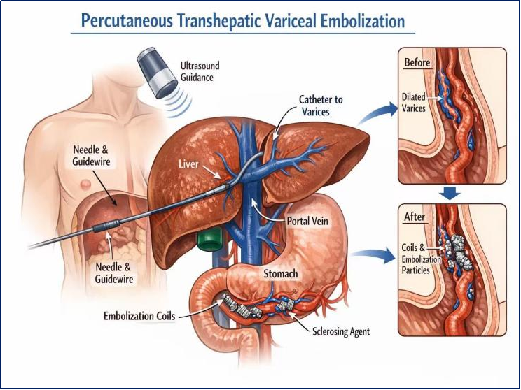 是通过微创穿刺,将栓塞材料注入胃冠状静脉,切断血流,减轻或消除食管胃底静脉曲张的压力负荷。该技术能够有效避免由于食管胃底静脉曲张引发的破裂出血。