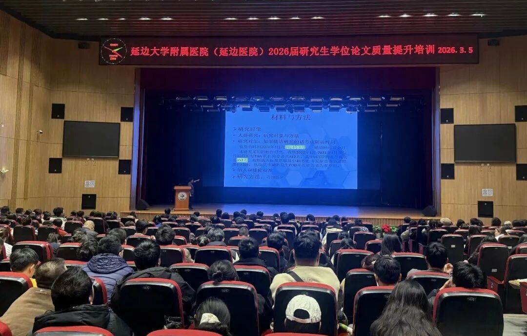 为助力2026届博硕士研究生做好学位论文收尾工作,提升论文质量,顺利备战盲审与答辩,3月5日,延边大学附属医院(延边医院)在科研医技楼十楼学术厅举办2026届博硕士研究生学位论文质量提升专题讲座。副院长姜哲出席活动并致辞,延边大学医学院及附属医院四位专家受邀担任主讲人,全体2026届即将毕业的博硕士研究生参加本次培训。