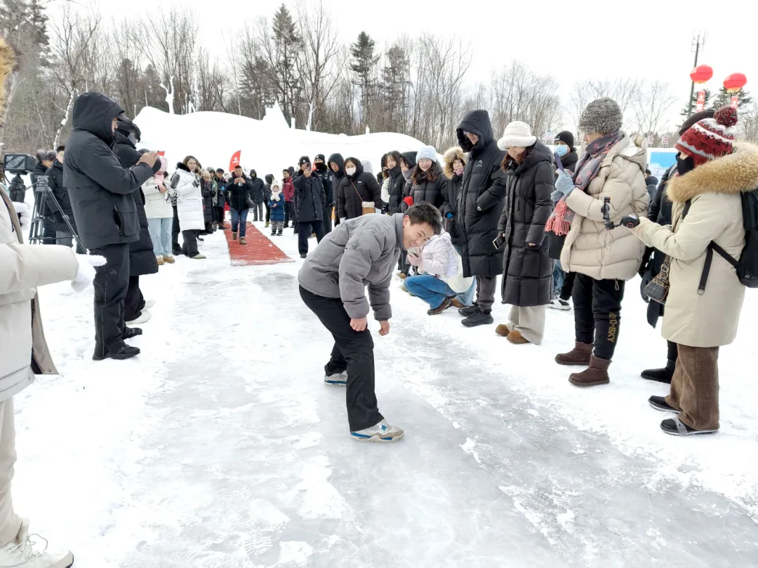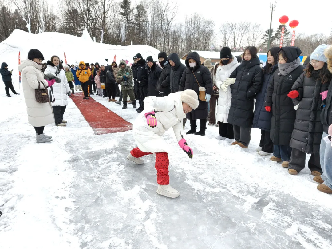 “打出溜滑”活动区人声鼎沸,大朋友与小朋友纷纷踏上冰面,或俯身疾滑,或稳步冲刺,围观者的呐喊助威声汇成欢乐的浪潮。