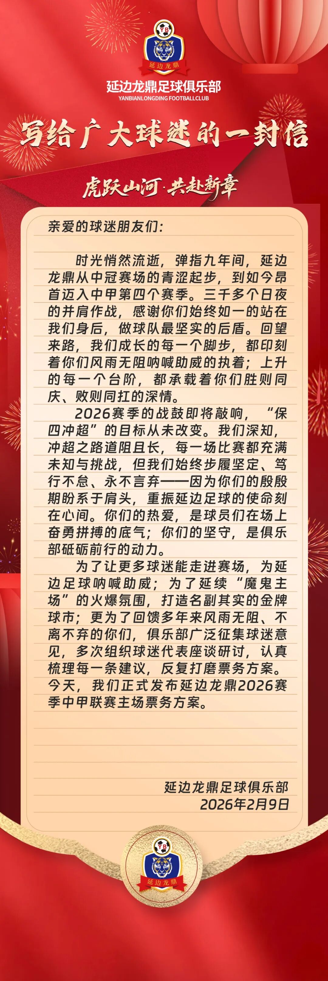 新赛季,每一张球票都是一份约定,每一次呐喊都是一份力量。愿我们同心同德、休戚与共,并肩奔赴赛场,把对足球的热爱、对家乡的深情,化作赛场上最震撼的声浪,共同铸就延边足球的崭新荣光!