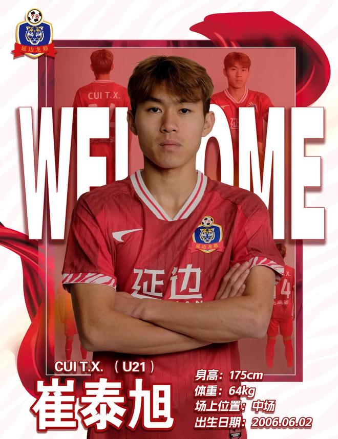 延边龙鼎足球俱乐部欢迎崔泰旭正式加盟延边龙鼎足球俱乐部,期待这名潜力出众的年轻球员,能在中场位置展现自身实力与风采,以青春热情与扎实表现为球队注入新活力,帮助球队再创佳绩。美丽延边欢迎你!
