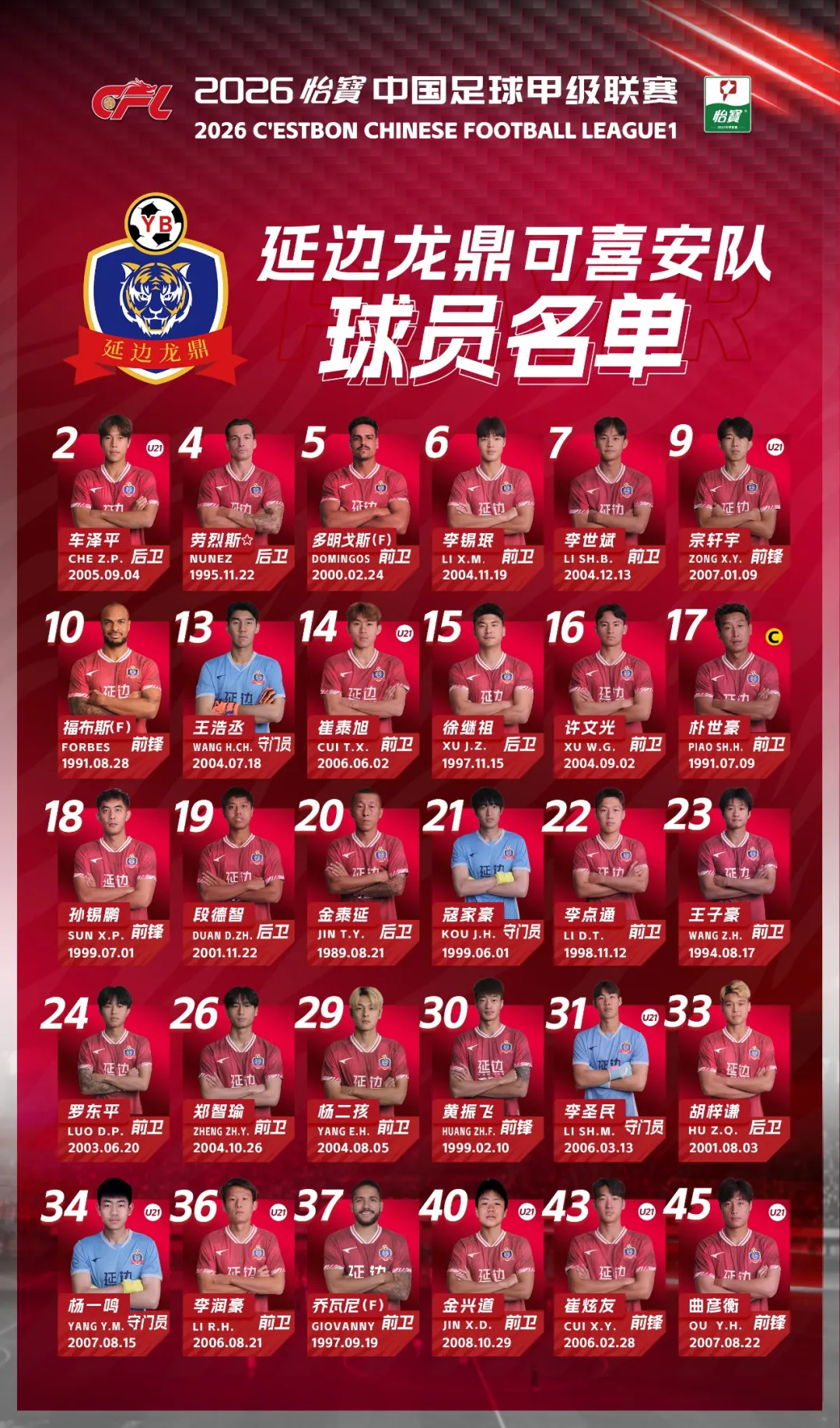龙鼎2026 · 官宣 | 延边龙鼎可喜安队2026赛季一线队大名单全家福