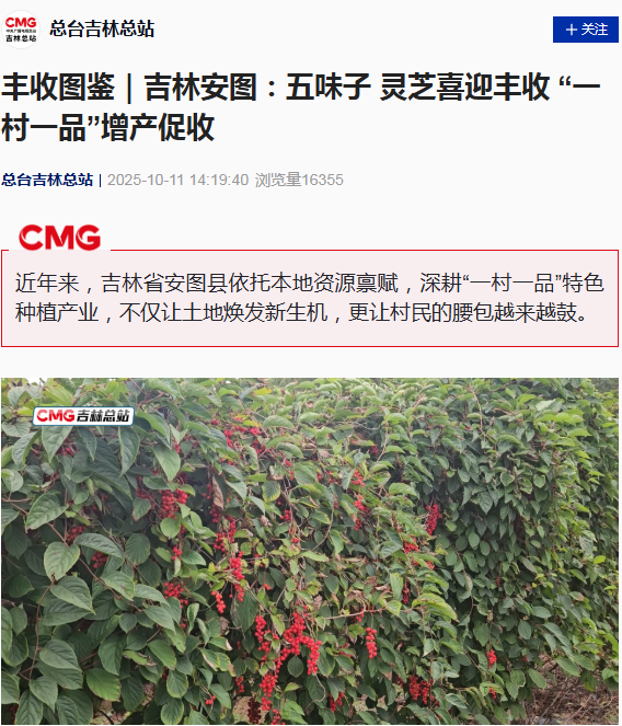 由安图融媒体中心与延边广播电视台联合采制的新闻《吉林安图:五味子 灵芝喜迎丰收“一村一品”增产促收》10月11日被央视新闻客户端采用。