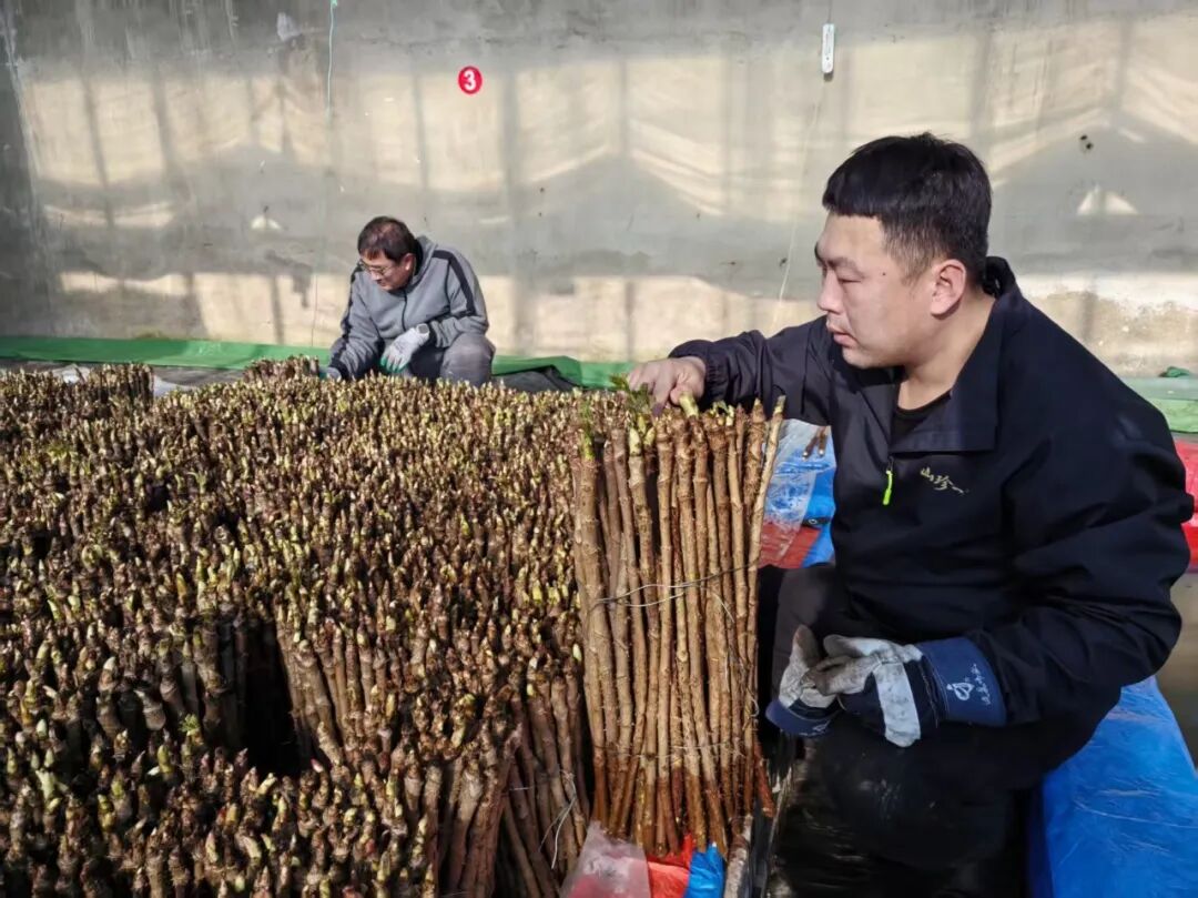 “这是刺嫩芽,学名刺龙芽,被誉为‘山菜之王’,不仅口感脆嫩清香,还富含皂甙、黄酮等营养成分,营养价值比普通蔬菜高出许多。”31岁的基地负责人于泳航戴着厚实的橡胶手套,小心翼翼地拨开一簇刺嫩芽芽胞向记者介绍。“以前我在汪清县罗子沟镇养藏香猪,后来转行到一家企业上班,边工作边琢磨自主创业,就瞄准了绿色产业。”于泳航擦了擦额头的汗珠,眼里闪着亮光,“我养猪那会儿,春天经常上山采刺嫩芽吃,咱东北人冬天就馋这口山野菜,但野生的刺嫩芽只有春天才有,反季种植肯定有市场。”去年8月,于泳航联合3名志同道合的年轻人,专程前往沈阳新民市的刺嫩芽种植企业学习技术,从枝条选种、水质调控到温度管理,他们把每个细节都记在笔记本上、印到脑海里。“反季水培看着简单,其实学问大着呢,水温要控制在8—12℃,室温得稳定在18—22℃,还要三天一通风、五天一换水。”于泳航指着水培池介绍,去年11月从辽宁采购来10万杆纯野生刺嫩芽杆,经过分级筛选后,于12月11日正式入池培育,“这些刺嫩芽杆都是精挑细选的,每根长度60厘米左右,芽胞完整饱满,只有这样才能长出好嫩芽。”
