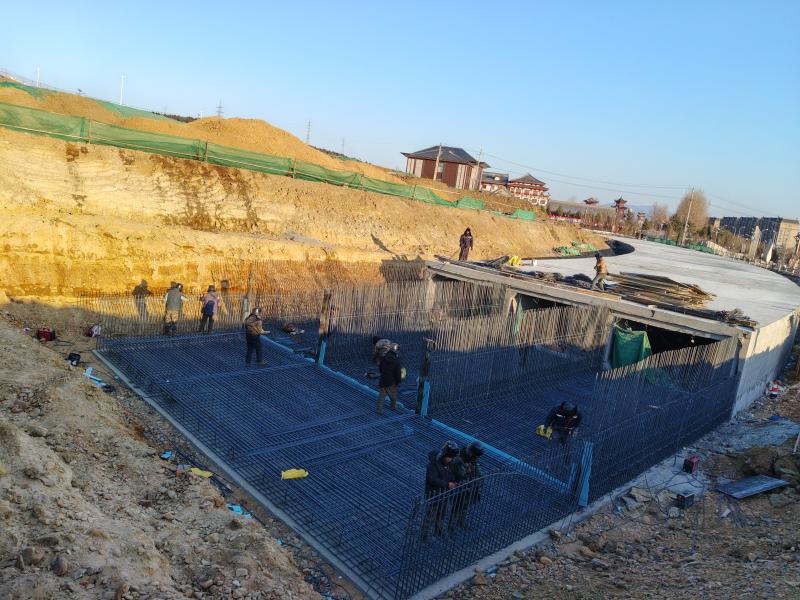 走进施工现场,紧邻331国道的围挡区域里,施工正忙。十几名工人专注进行钢筋弯制、焊接作业,直径28毫米的粗钢筋经过精细加工后,由炮车拉载到各作业点位;地面下深沟里的水泥垫层上,二十几名工人在绑扎钢筋;作业面后方,三孔混凝土涵渠已经浇筑成型,初具规模。向西约100米处,一处长约50米、宽约15米的弧形结构体被绿色棉被严密包裹,一旁的水泥泵车伸展长臂,向棉被内精准喷射混凝土,工人们有序进行混凝土浇筑作业。两处混凝土涵渠作业点之间,两台钩机、一台铲车、三辆翻斗车协同配合,挖渠运土的作业节奏紧凑高效。