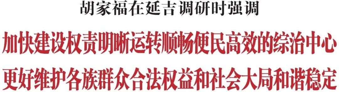 胡家福首先来到延吉市北山街道综治中心,与中心负责人深入交流,认真听取综治中心建设运行情况汇报,详细询问运行机制、矛盾化解等情况。他指出,街道是联系服务群众的第一窗口,是维护社会和谐稳定的第一防线。要切实发挥植根基层、融入群众的优势,充分调动网格队伍积极性、主动性,及时排查发现矛盾苗头、潜在风险,最大限度把矛盾纠纷化解在基层、消除在萌芽状态,努力实现“小事不出社区、大事不出街道、矛盾不上交”。