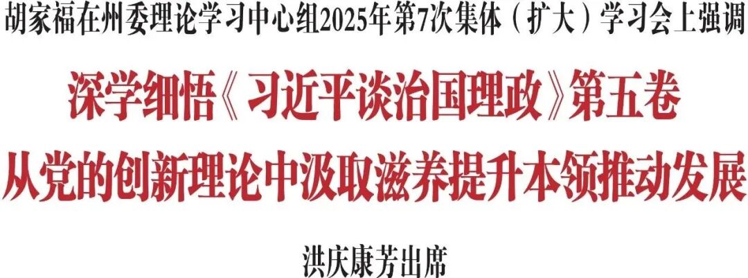 10月15日,省委常委、州委书记胡家福主持召开州委理论学习中心组2025年第7次集体(扩大)学习会。他强调,要深学细悟《习近平谈治国理政》第五卷,深刻领悟蕴含其中的精髓要义、丰富内涵和实践要求,从党的创新理论中汲取滋养、提升本领、推动发展。州委副书记、州长洪庆,州政协主席康芳出席会议。