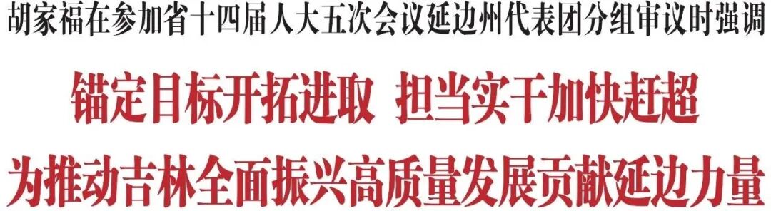 1月28日,省委常委、州委书记胡家福参加省十四届人大五次会议延边州代表团分组审议。他强调,延边州要坚持以习近平新时代中国特色社会主义思想为指导,在省委、省政府的坚强领导下,按照省委经济工作会议和《政府工作报告》的部署要求,锚定目标、开拓进取,担当实干、加快赶超,推进全州经济实现质的有效提升和量的合理增长,为推动吉林全面振兴高质量发展贡献延边力量。