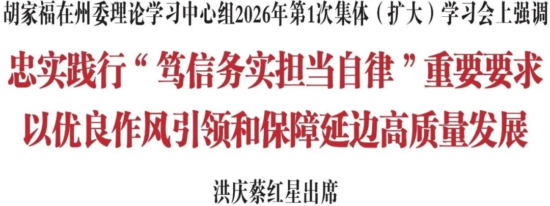 2月6日,省委常委、州委书记胡家福主持召开州委理论学习中心组2026年第1次集体(扩大)学习会。他强调,要深入学习贯彻习近平总书记关于深入贯彻中央八项规定精神学习教育的重要指示精神和在中央政治局民主生活会上的重要讲话精神,巩固拓展学习教育成果,忠实践行“笃信、务实、担当、自律”重要要求,以优良作风引领和保障延边高质量发展。州委副书记、州长洪庆,州人大常委会主任蔡红星出席会议。