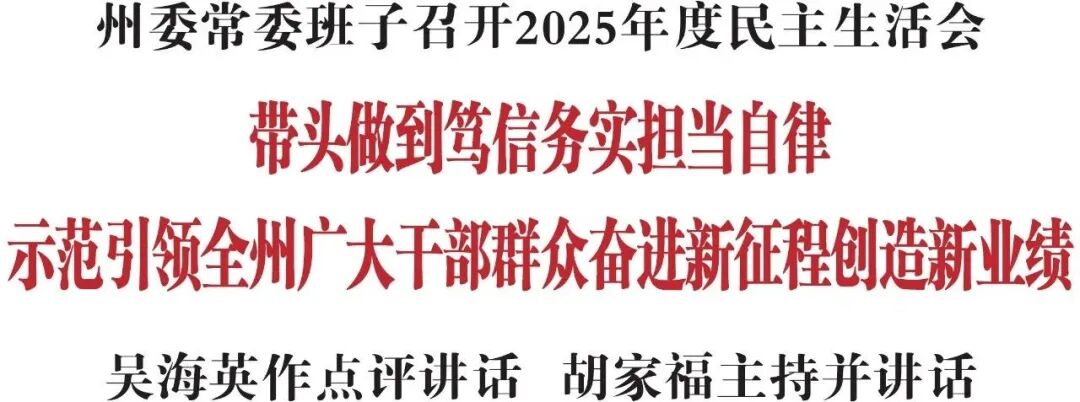 按照党中央部署要求和省委统一安排,2月6日,州委常委班子召开2025年度民主生活会,以中共中央政治局民主生活会、省委常委班子民主生活会为标杆,围绕“深入学习贯彻习近平新时代中国特色社会主义思想,全面贯彻落实党的二十届四中全会精神,以打攻坚战、持久战的决心和恒心,锲而不舍落实中央八项规定精神,推进作风建设常态化长效化,以优良作风凝心聚力、真抓实干,奋力开创中国式现代化建设新局面”这一主题,紧密联系思想、工作和作风实际,深入查摆突出问题,深刻剖析问题根源,严肃开展批评和自我批评,有针对性地提出整改举措。省委副书记吴海英到会指导并作点评讲话。省委常委、州委书记胡家福主持会议并讲话。省委督导组有关同志到会指导。州人大常委会党组书记、主任蔡红星,州政协党组书记、主席周金星列席会议。
