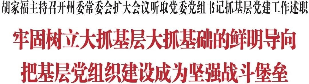 胡家福强调,做好党建工作是各级党组织的首要职责和第一要务。各级党组织书记要把党建工作作为首要政治任务来抓,严格执行定期议党和专题议党等制度,及时研究解决基层党建工作事项,做到重要工作亲自部署、重大问题亲自过问、重要环节亲自协调、落实情况亲自督办。要坚持问题导向、效果导向相统一,对党建重点工作内容进行细化分解和量化分工,科学制定时间表、任务书,把分散的组织资源整合起来、利用起来,形成和放大组织优势,切实提高基层党建工作的精准度和实效性。要分级分类抓好述职评议考核工作,健全完善“调度+督导+督办”考核机制,既要重视规定动作“硬指标”的督导考核,也要注重干部群众意见“软指标”的评价吸纳,及时发现问题、校正措施,及时奖优罚劣、传导压力,推动全州基层党建工作不断进步、整体提升。