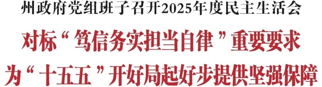 洪庆强调,州政府党组班子成员要深入学习贯彻习近平总书记在中共中央政治局民主生活会上的重要讲话精神,落实省委常委班子和州委常委班子民主生活会要求,对标“笃信、务实、担当、自律”的重要要求,查找差距、明确方向,锲而不舍落实中央八项规定精神,推进作风建设常态化长效化,为“十五五”开好局、起好步提供坚强保障。要坚定“笃信”方向,坚持用马克思主义及其中国化创新理论武装头脑、指导实践、建强队伍,在深化理论武装中提升政治自觉。要坚持“务实”标准,在“真抓实干、务求实效”上见真章、在“心系群众、为民造福”上用真情、在“锤炼能力、提升本领”上求突破,在促进成果转化中服务发展大局。要树立“担当”导向,强化“知重负重、迎难而上”的发展担当、“锐意开放、先行先试”的开放担当、“坚守底线、化危为机”的底线担当,在攻坚克难中积极履职尽责。要落实“自律”要求,在“深查实改”上下功夫、在“完善机制”上做文章、在“化风成俗”上求实效,在健全机制中推动作风长效。