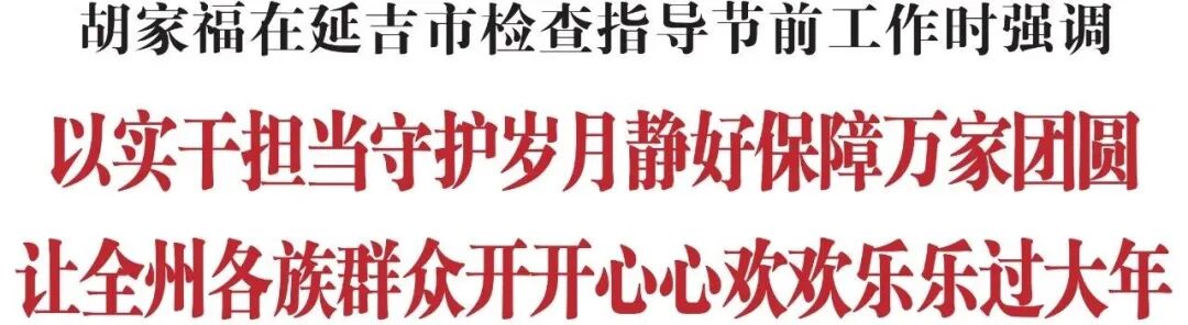 2月14日,省委常委、州委书记胡家福到延吉市检查指导节日期间市场供应、食品安全、供热保障、安全生产、交通运输、消防安全、治安防控、边境管理等工作,看望慰问基层一线工作人员,向他们致以新春祝福。他强调,要深入贯彻习近平总书记重要讲话重要指示精神,按照省委省政府部署要求,扎扎实实做好保供应、保安全、保民生等各项工作,以实干担当守护岁月静好、保障万家团圆,让全州各族群众开开心心、欢欢乐乐过大年。