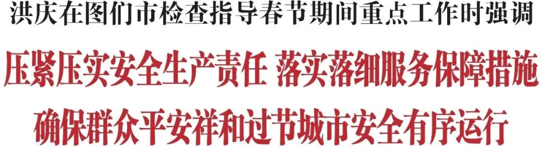 2月15日,州委副书记、州长洪庆到图们市检查指导春节期间重点场所、重点企业安全生产及应急值守等工作。他强调,要压紧压实安全生产责任,落实落细服务保障措施,确保群众平安祥和过节、城市安全有序运行。