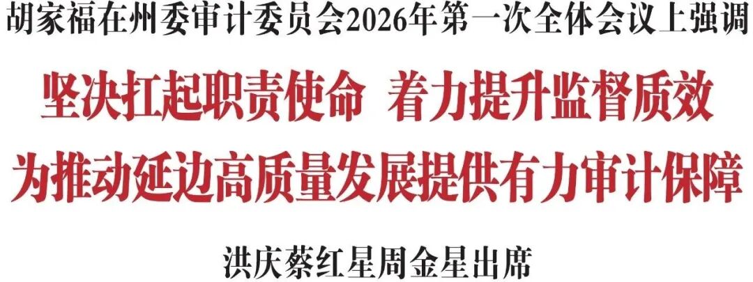4月2日,省委常委、州委书记、州委审计委员会主任胡家福主持召开州委审计委员会2026年第一次全体会议。他强调,要深入贯彻习近平总书记关于审计工作的重要指示精神,按照全国、全省审计工作会议的部署要求,坚决扛起职责使命,着力提升监督质效,为推动延边高质量发展提供有力审计保障。州委副书记、州长、州委审计委员会副主任洪庆出席会议。州人大常委会主任蔡红星、州政协主席周金星出席会议。