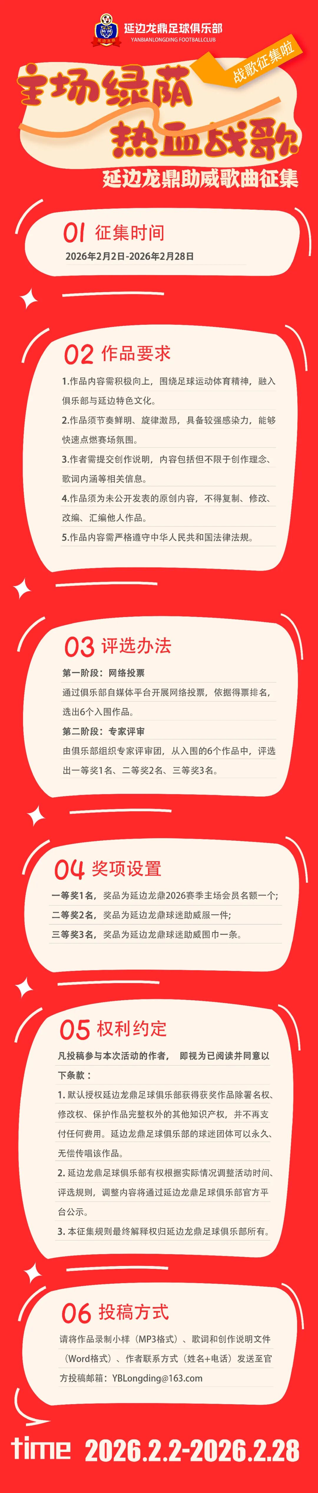 为进一步弘扬延边“足球之乡”文化内核,打造具有本土特色的球迷主场文化,延边龙鼎足球俱乐部现面向社会各界热爱足球与音乐的人士,正式发起球队助威歌曲征集活动。