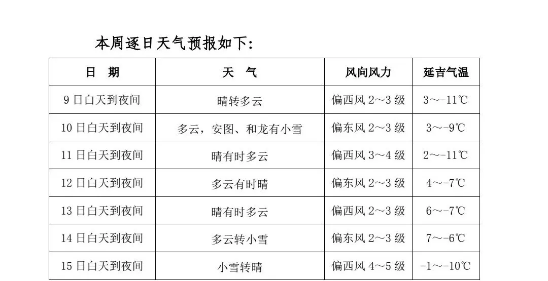 预计本周(2月9日-15日)总的天气趋势是气温明显偏高,降水明显偏少。预计全州平均气温为-4.0℃左右,比常年同期高5.6℃左右,9日开始气温明显回升,12日-14日最高气温一般为4℃~7℃,15日气温下降。全州平均降水量不足0.5毫米,比常年同期明显偏少。预计10日安图、和龙有小雪,14日夜间到15日白天有小雪。