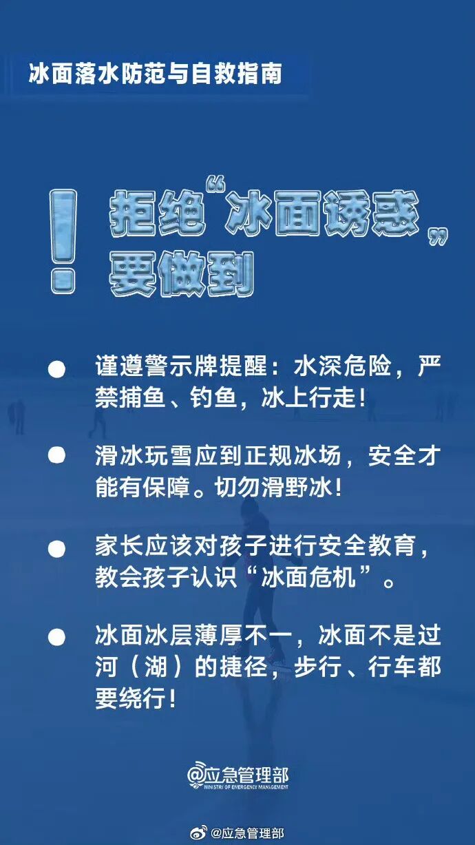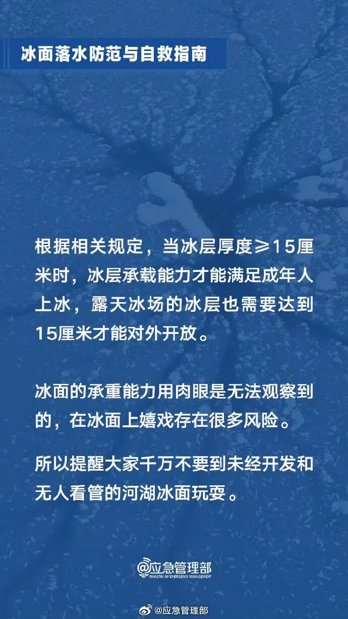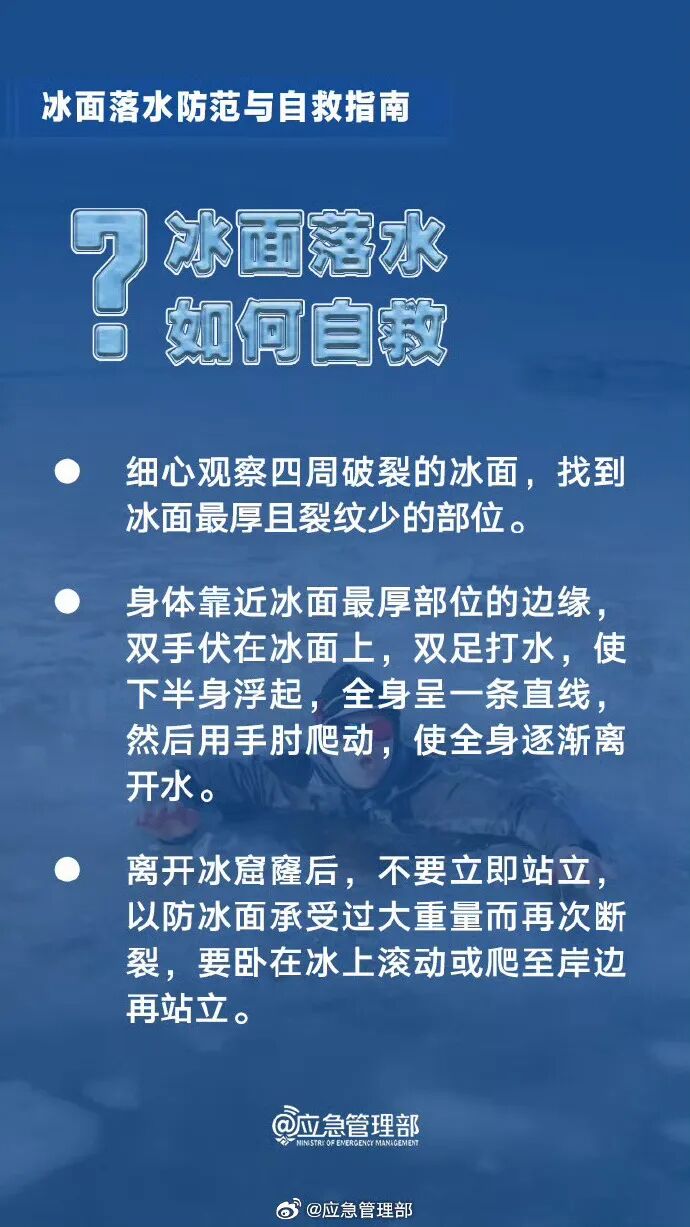 春节假期,一些河湖水面结冰,但薄厚不一,一些看似结实的冰面其实可能隐藏着安全隐患,切不可贸然上冰。若在冰面上逗留、玩耍,极有可能发生冰面破裂,导致落入水中。万一掉进冰窟窿里,该如何自救?这份冰面落水与自救指南请查收→