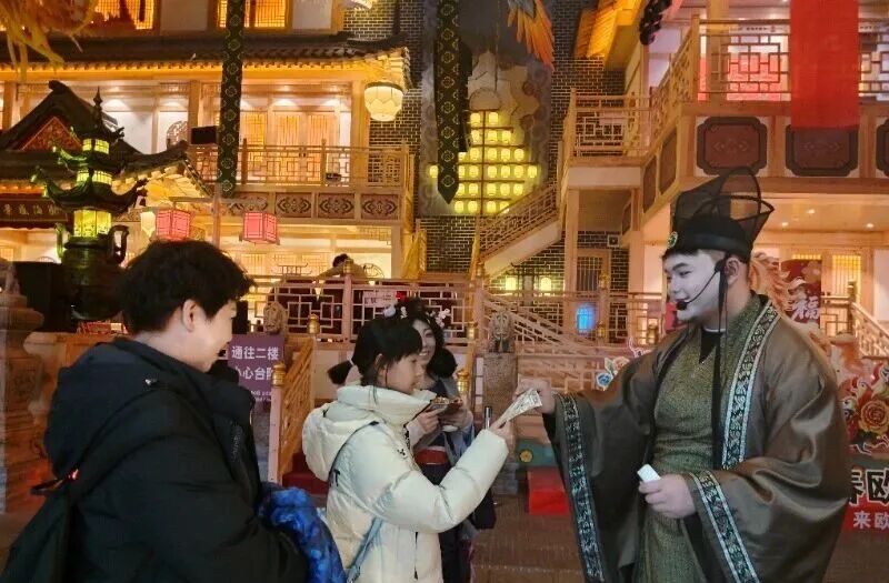 2月15日下午,古镇内的仿唐建筑群被红灯笼、新春福字、国风装置装点一新,节日氛围浓厚。为丰富游客体验,古镇内设置了多项新春互动游戏,让不同年龄段的游客都能尽兴游玩。投壶、射箭、套圈、猜灯谜等传统游戏趣味十足,游客们轮番上阵、比拼技艺,赢取新春小礼品;NPC沉浸式互动体验,让游客化身“渤海使者”,参与剧情打卡、任务闯关,在游玩中解锁渤海国历史文化。来自安徽的游客雨柔表示,这些游戏都很好玩,参与感十足,过年能来这里游玩,她觉得很开心。