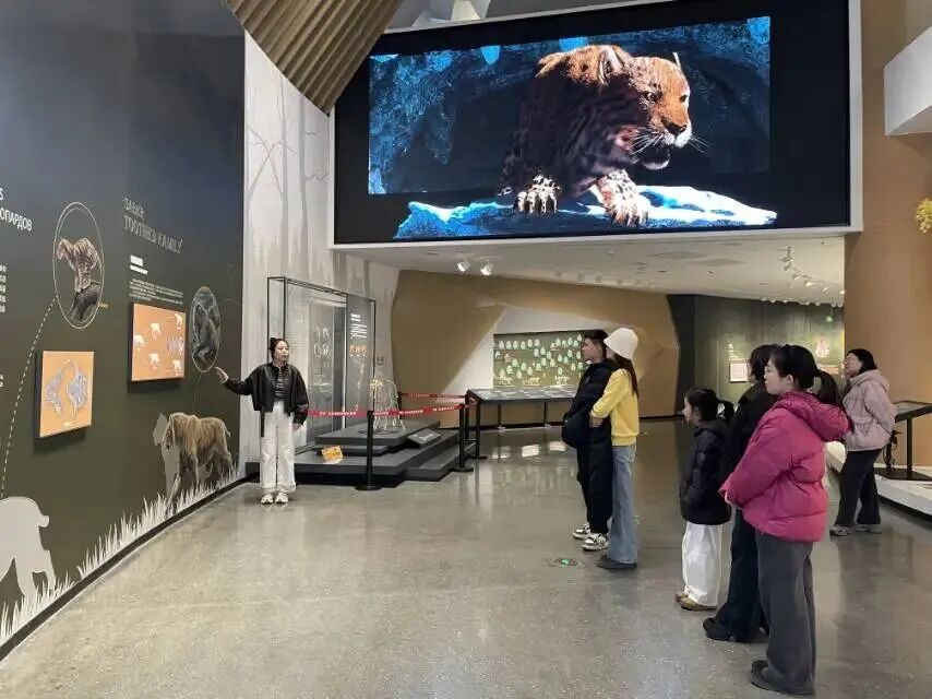 饭后,伴着新春的暖阳,两个家庭一同走进珲春东北虎豹自然科普馆,在沉浸式体验中,感受边城珲春的生态之美与人文底蕴。馆内仿真森林光影柔和,东北虎豹标本栩栩如生。电子沙盘上,“天地空一体化”监测系统实时呈现野生动物活动轨迹,展现着珲春守护东北虎豹家园的执着与努力,让于子涵赞叹不已。