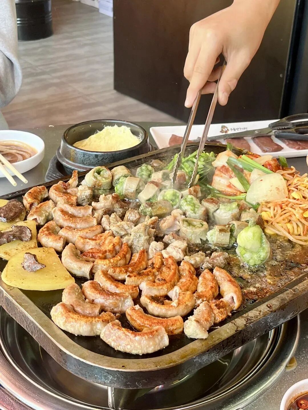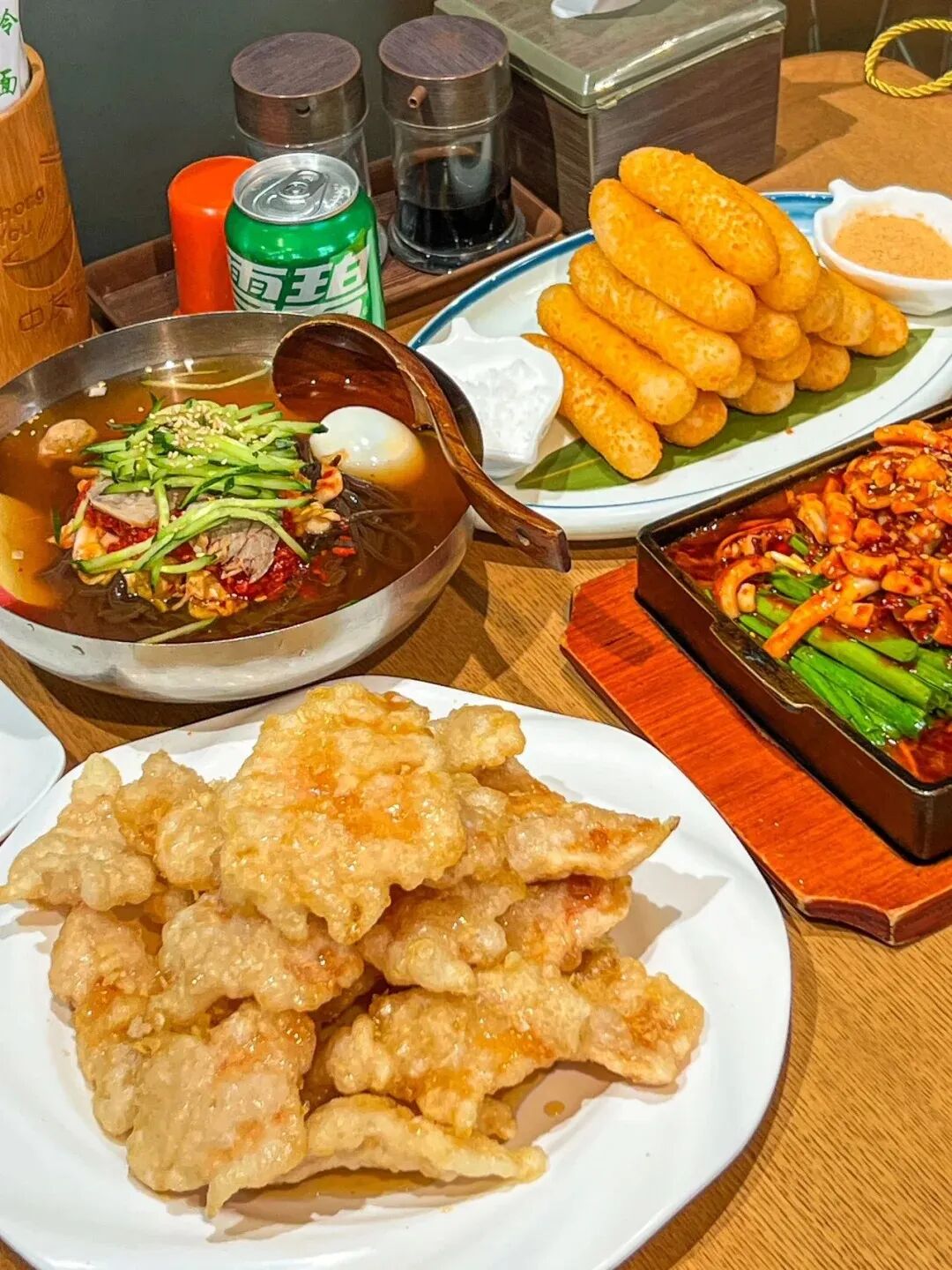 🔥非遗主食:石锅拌饭上桌时滋滋作响,锅巴焦香;冷面配锅包肉,让肉片浸入冰凉的汤里——这是当地人的隐藏吃法;还有米肠、菜包肉,每一口都是传统味道。