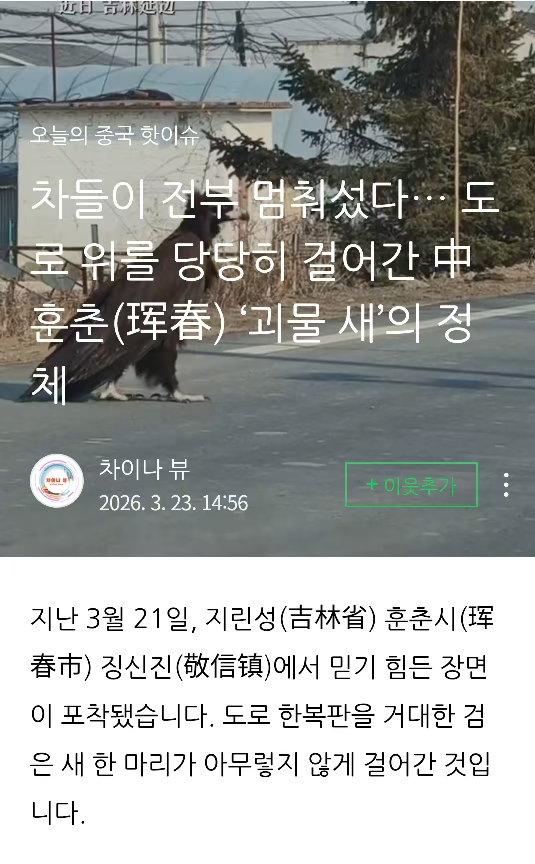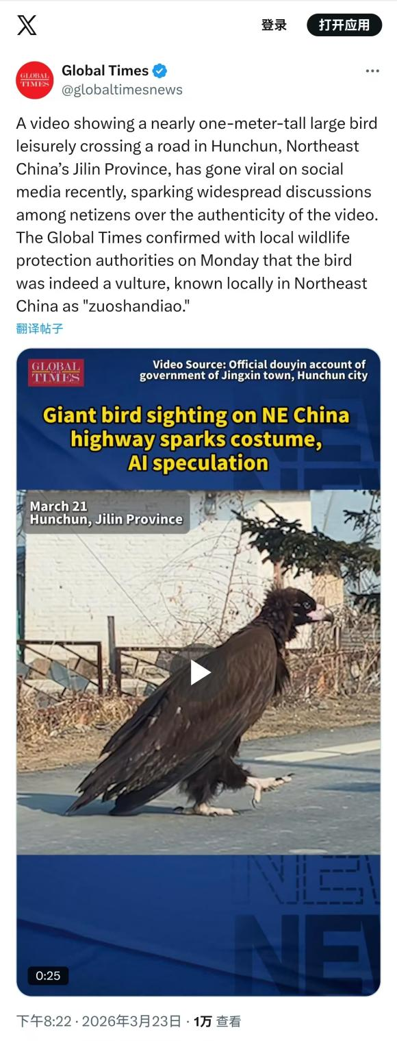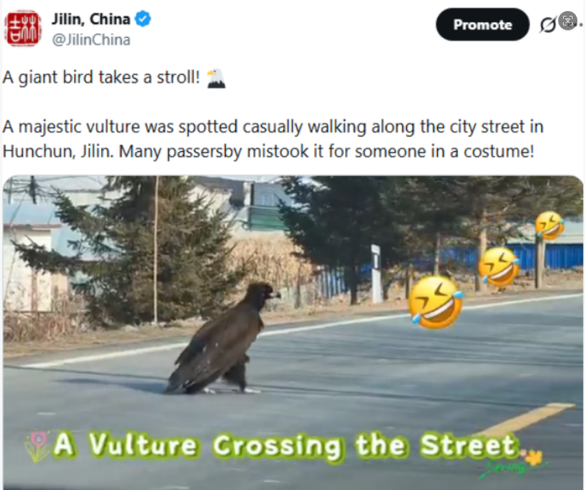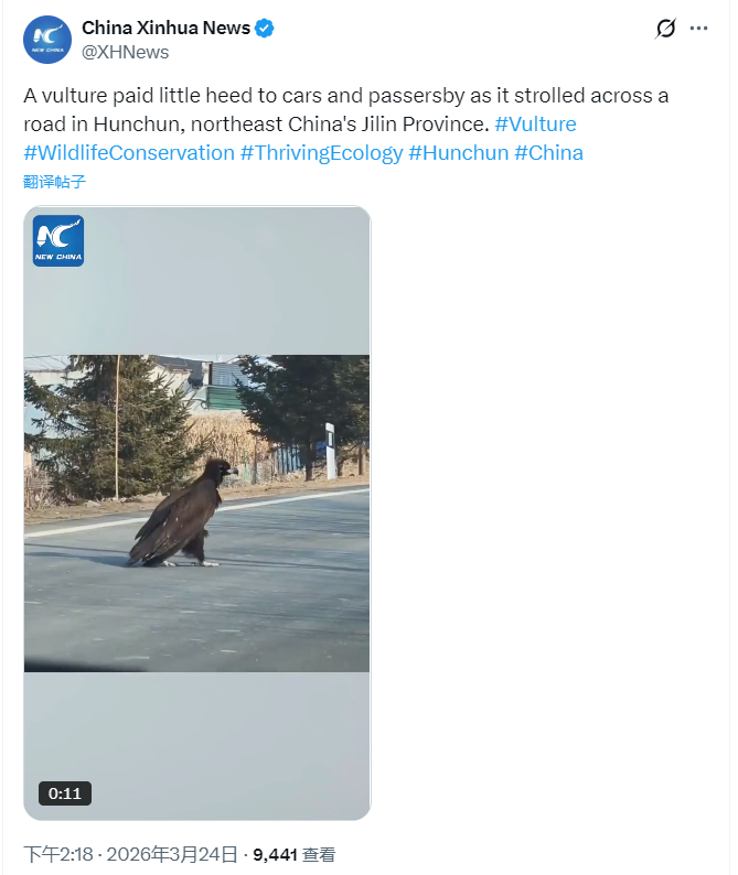 近日,吉林珲春敬信镇302国道上,一只近1米高、翼展约2米的秃鹫(东北俗称“座山雕”)从容过街、车辆主动避让的短视频在海外社交平台持续走红,引发广泛关注和热议,成为展现吉林生态保护成果、传播中国生态文明理念的鲜活窗口。