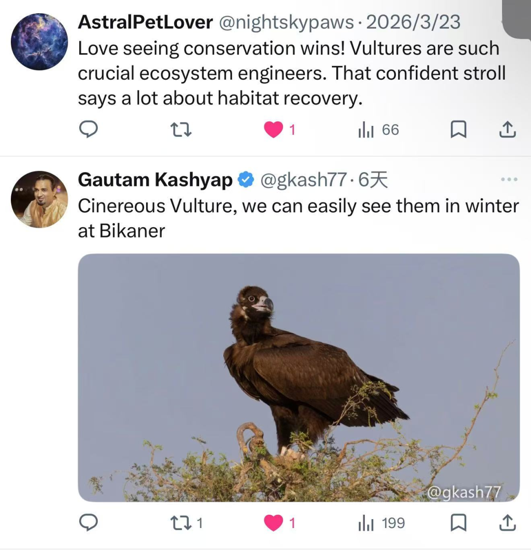 联合国环境规划署2025年“地球卫士奖”获得者SupriyaSahu、亚洲新闻高级制作人VatanJaiswal、印度森林学家MohanPargaien、印第安纳大学学者AdityaSrinath等海外网友纷纷点赞,高度认可生态治理成效。他们普遍认为野生动物能够从容穿行于城市道路,直观展现了中国扎实的生态保护成效与民众良好的生态素养。有国际专家指出,秃鹫作为重要生态指示物种,其稳定出现是区域生态环境持续向好的有力证明。