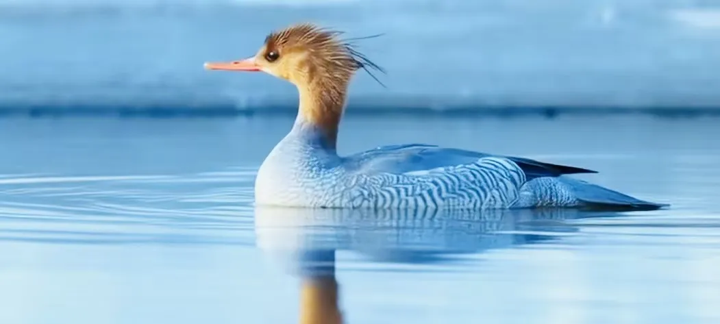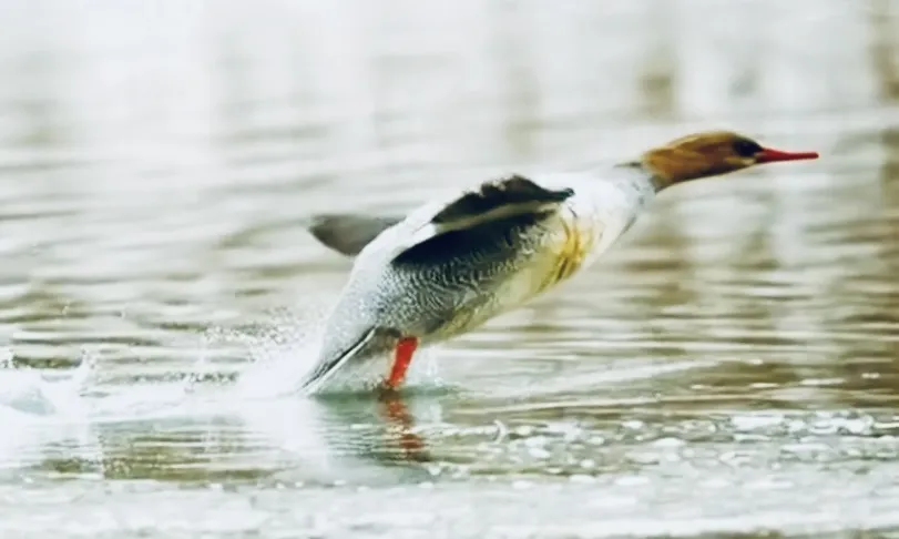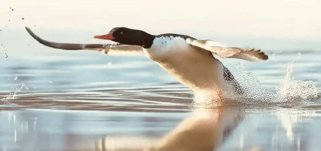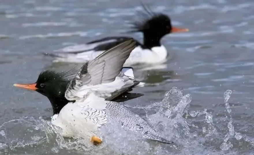 中华秋沙鸭是鸭科秋沙鸭属动物,是中国国家一级重点保护野生动物,有“鸟中大熊猫”之称,属国宝级动物,被列入《世界自然保护联盟》濒危物种红色名录濒危物种。由于中华秋沙鸭对生存环境非常挑剔,主要栖息于阔叶林或针阔混交林的溪流、河谷草甸等地的清澈水面,也有“生态试纸”之称。秋沙鸭成对或以家庭为群;潜水捕食鱼类;嘴形侧扁,前端尖出,嘴和腿脚红色;雄鸭头部和上背黑色,下背、腰部和尾上覆羽白色;翅上有白色翼镜,头顶的长羽后伸成双冠状;胁羽上有黑色鱼鳞状斑纹。